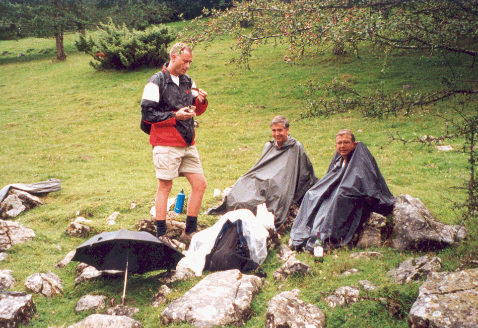 Si el paraigües és ridícul, les capelines del Monolo i jo no ho són menys. Sort que el Joan porta l'uniforme escaient.